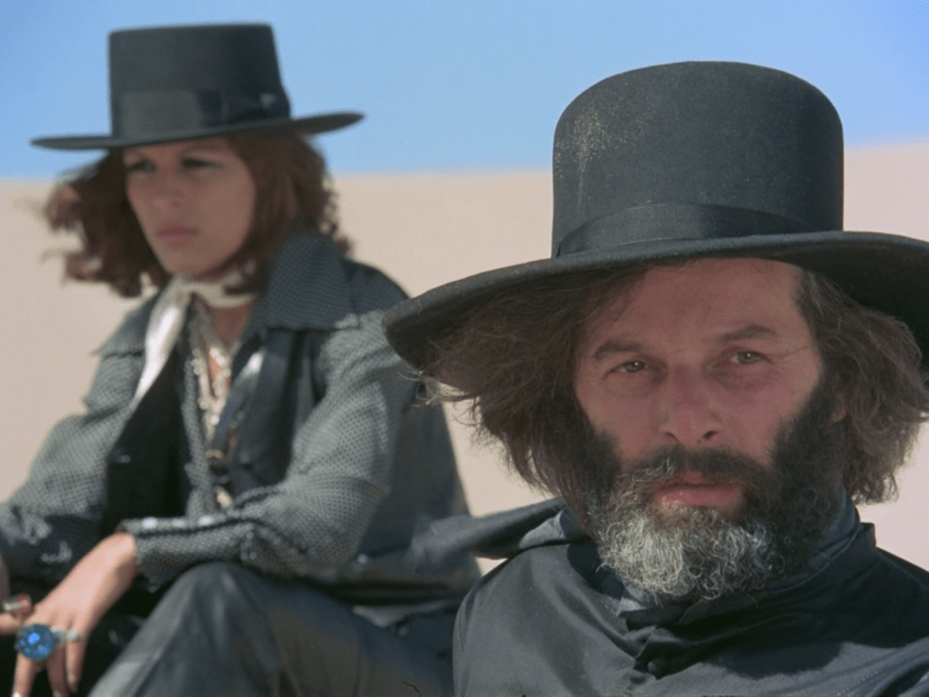 The movie takes place in two parts. The first half, in an unnamed desert, begins with the title character, accompanied by his naked son, hunting down and killing a band of outlaws who have butchered the inhabitants of a town. After leaving his son with monks he has rescued from the outlaws, he rides off with a woman the outlaws had kept captive to defeat the four great masters of pistol duelling. As El Topo encounters each of the first three masters, the master teaches El Topo a lesson and they then duel, in which El Topo cheats every time. The final master kills himself, in a demonstration of the unimportance of life. The first half ends with El Topo’s betrayal and near-murder by the woman and an unnamed informant.