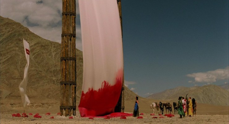 A visually stunning movie about a beautiful little Persian girl with a wild imagination who worked in the citrus groves of California in 1913, and who is in a sanotorium/hospital after falling and breaking her arm. She meets a young suicidal actor who tells her tall tales while they are both in the hospital. The director is Tarsem, helped with producers Spike Jonze and David Fincher.