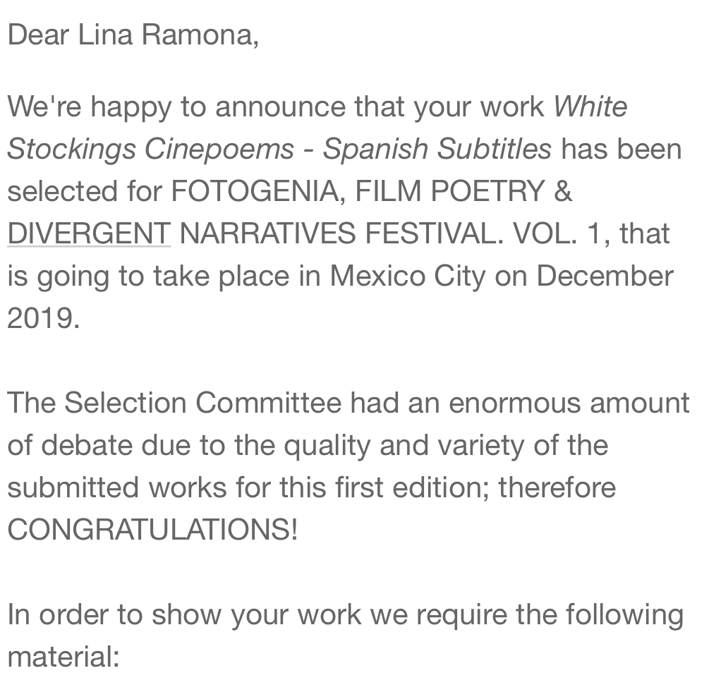 I am thrilled to announce that my White Stockings cinepoems—in collaboration with filmmaker & visionary / media artist Tess Cortés—have been selected as finalist for the upcoming Festival Fotogenia in Mexico City this December.