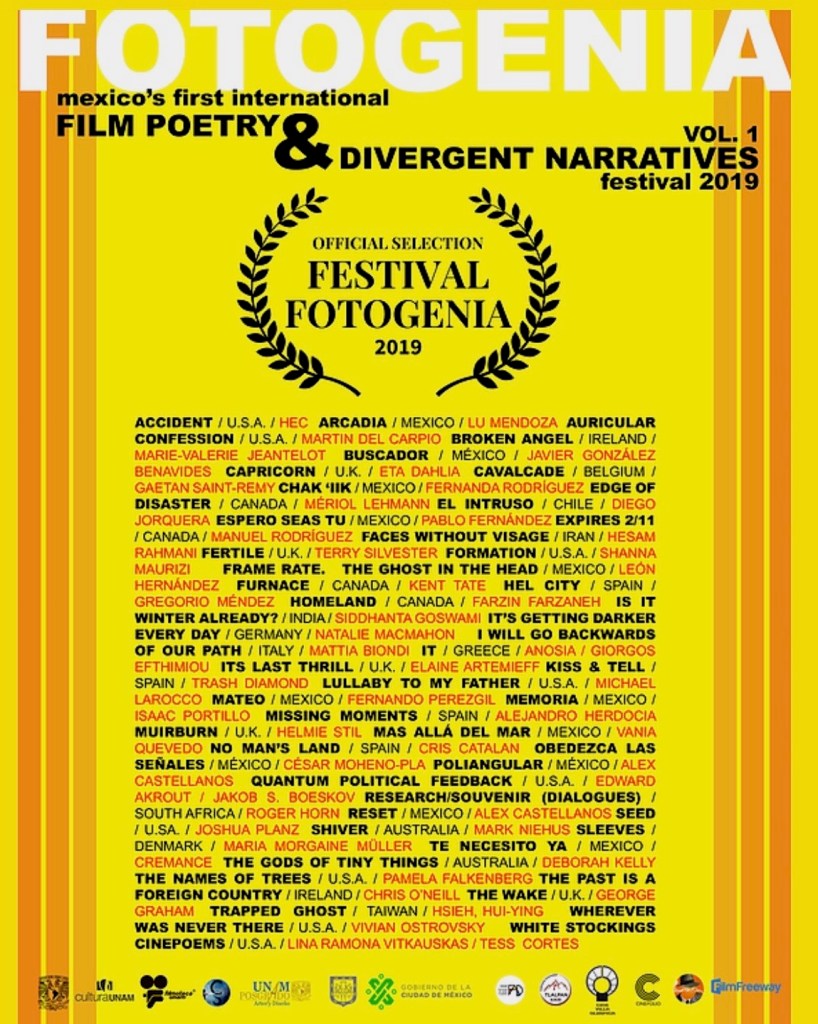 FOTOGENIA is the first international film poetry and divergent narratives festival of its kind in Mexico City, promoting a space for alternative conception of films, celebrating experimentation and avant-garde framework and the love of curiosity and research of the seventh art. December 12-14, 2019 (Film Poetry, Videoart, Experimental Cinema, Avant-garde films).