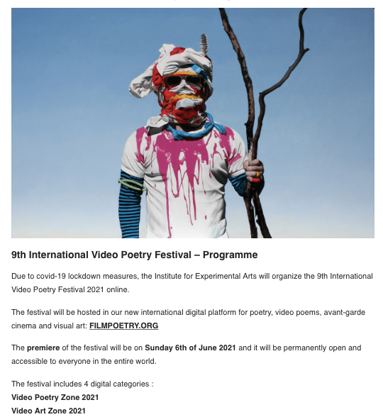 Extremely proud to announce that my work was included as part of this impressive list of filmmakers, video poets, and artists – Sunday, June 6, 2021.