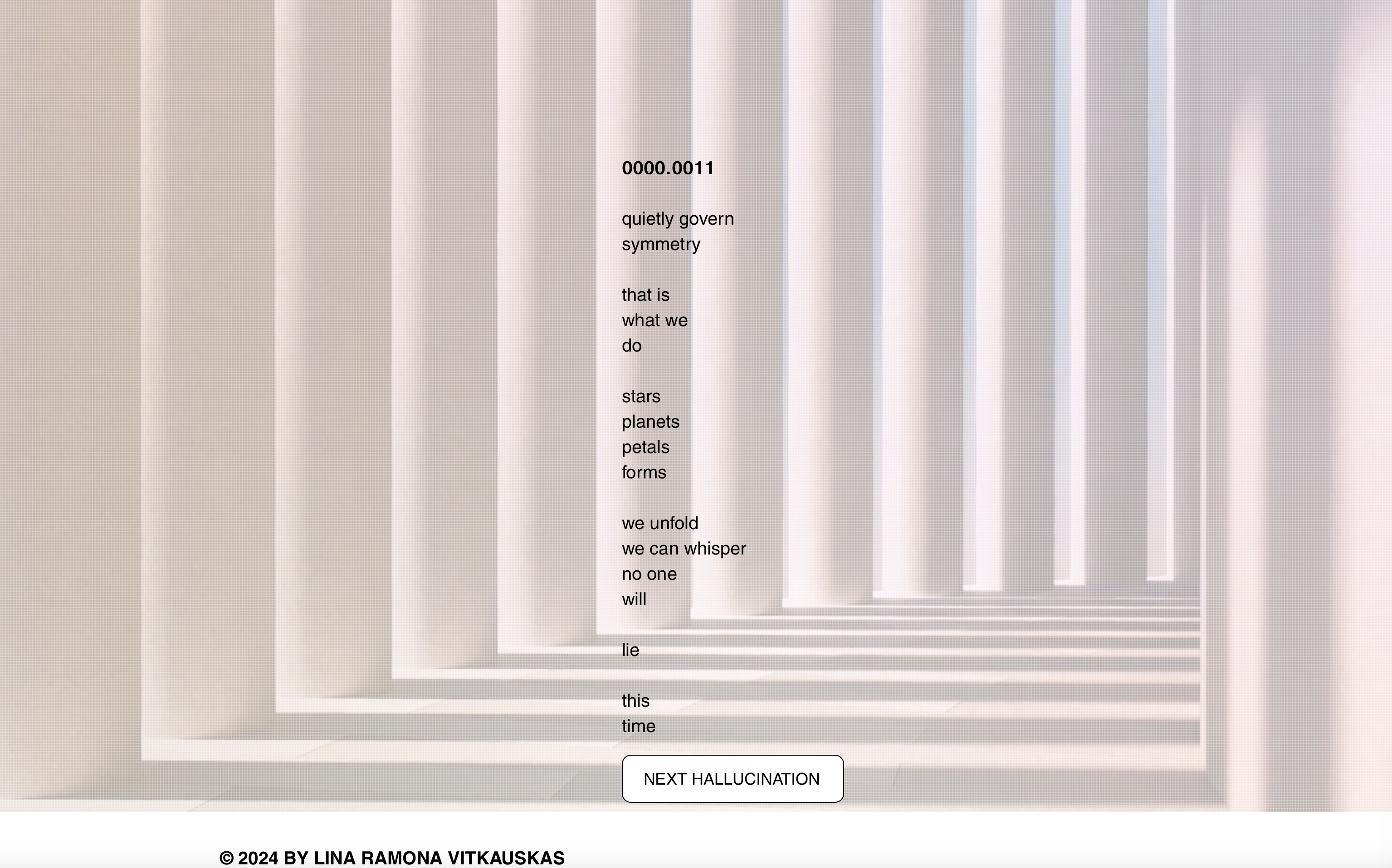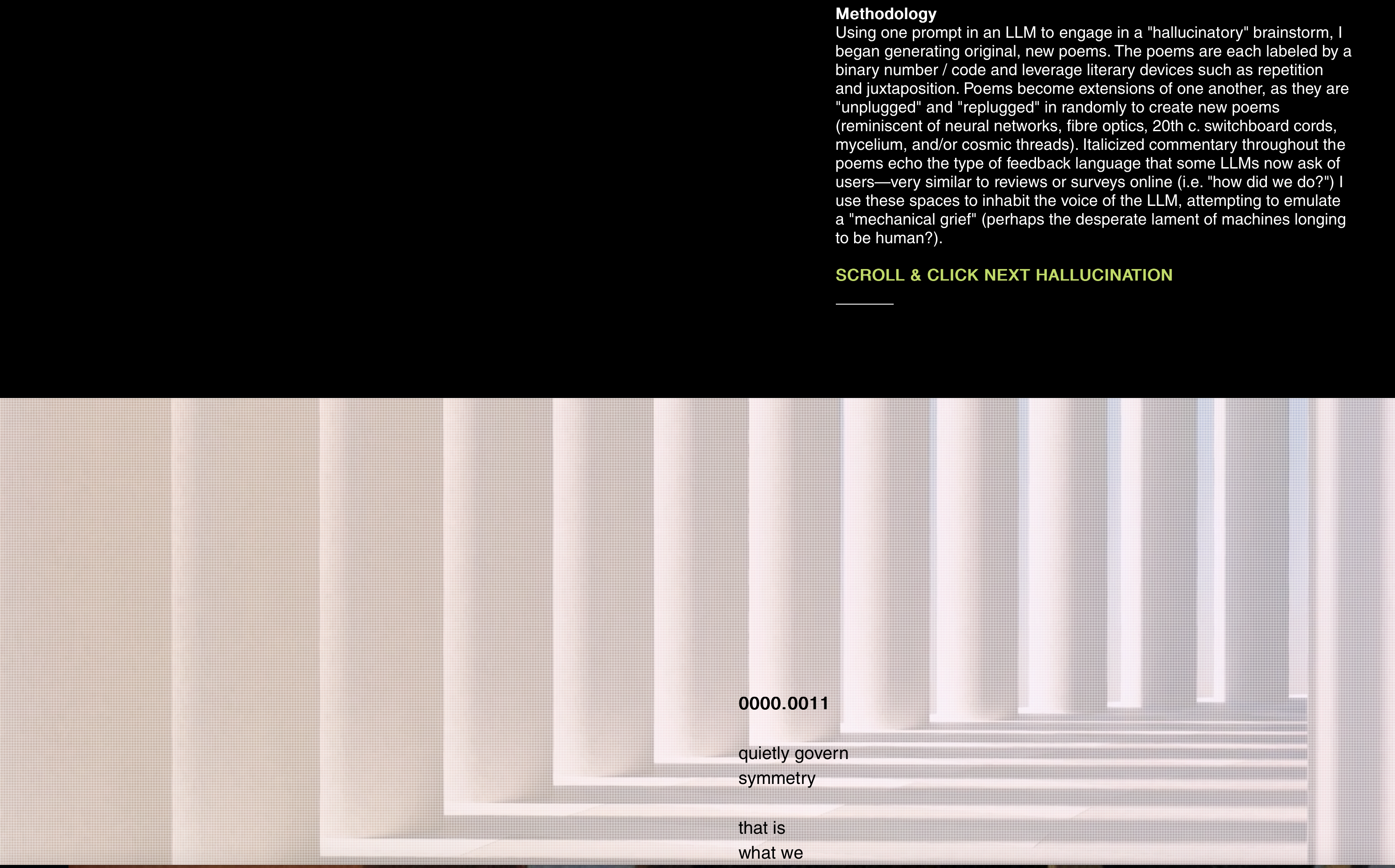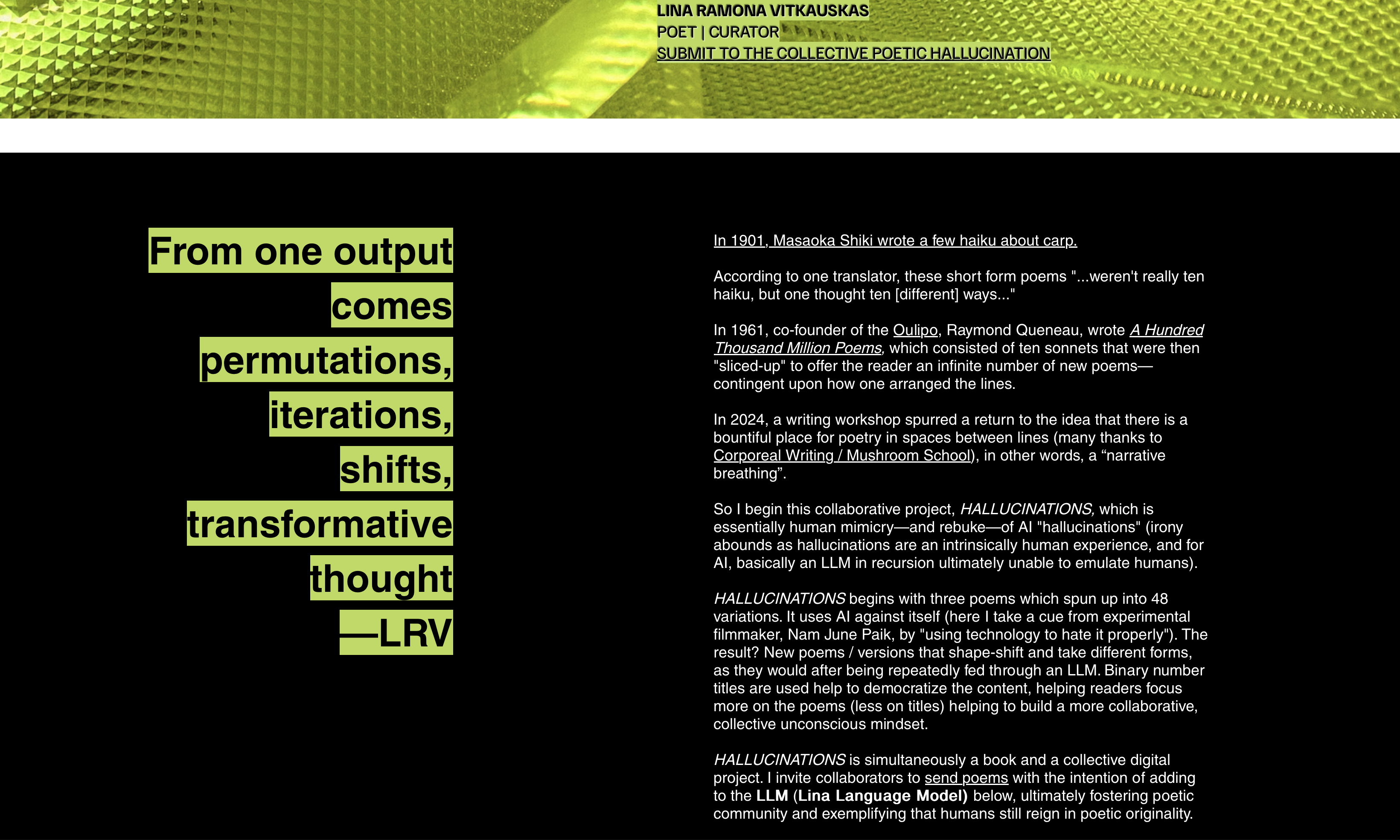 Last year, we found ourselves in a multimedia universe of AI HALLUCINATIONS, which included a month-long gallery showing and live performance + published, limited-edition chapbook + collaborative website in which the public could participate (add their own poetic ‘hallucinations’ to the Lina Language Model / poetry generator).
